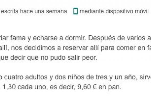 Se queja de que les cobraron 9,60 por el pan, que las rabas “eran de las malas”, “llenas de rebozado del que se despega nada más mirarlas”. El pulpo, subraya, tenía “un exceso de salsa considerable, no estaba terso sino como chicle, y era bastante escaso”.