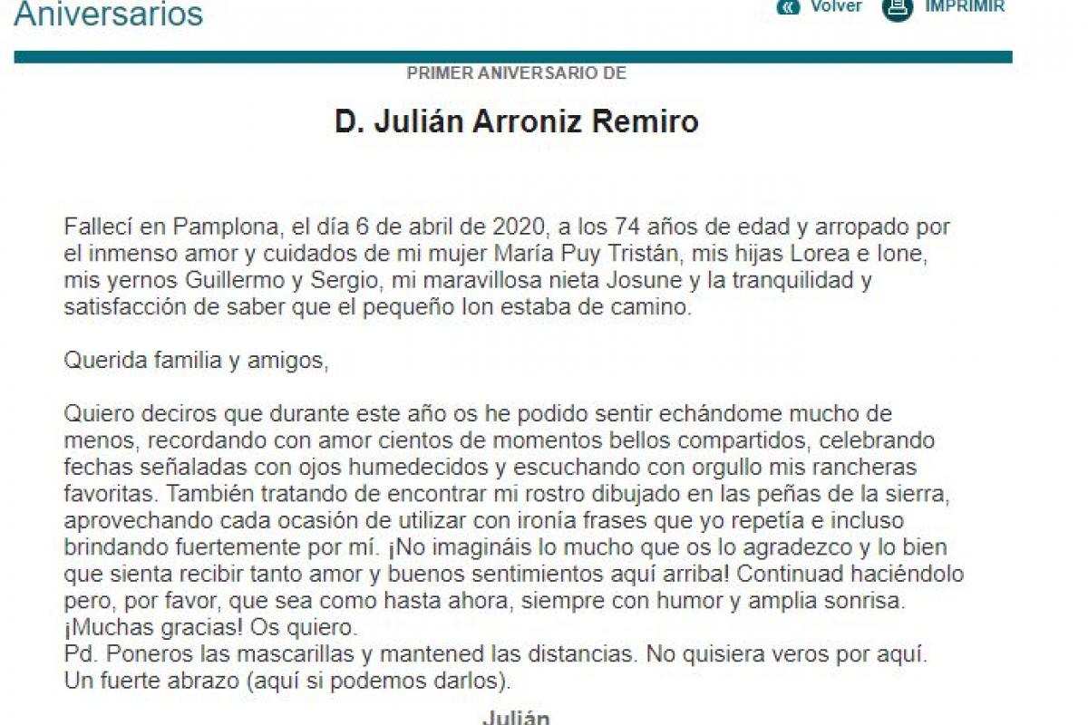 Las medidas de seguridad del coronavirus están más que claras, pero nunca está de más recordarlo. Eso es lo que han debido de pensar los que han dedicado una esquela de aniversario a Julián Arróniz, un hombre que falleció el 6 de abril de 2020 a los 74 años.