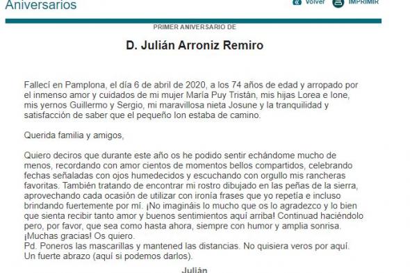 Las medidas de seguridad del coronavirus están más que claras, pero nunca está de más recordarlo. Eso es lo que han debido de pensar los que han dedicado una esquela de aniversario a Julián Arróniz, un hombre que falleció el 6 de abril de 2020 a los 74 años.