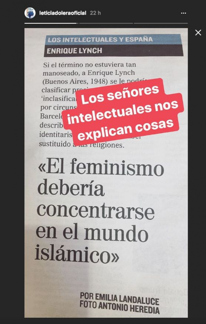 En las imágenes se pueden ver unas capturas de la edición en papel del diario. En la primera de las fotos, la actriz y directora de cine señala el titular con un menaje que destila cierta ironía: "Los señores intelectuales nos explican cosas", escribe Dolera sobre un fondo rojo.