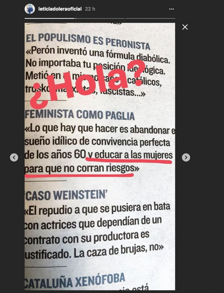 Leticia Dolera ha publicado este sábado dos imágenes en su cuenta de Instagram Stories para mostrar su indignación al leer las declaraciones que hizo el académico y escritor Enrique Lynch sobre el feminismo en una entrevista para el diario El Mundo.