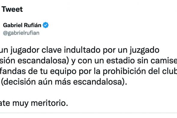 “Con un jugador clave indultado por un juzgado (decisión escandalosa) y con un estadio sin camisetas ni bufandas de tu equipo por la prohibición del club local (decisión aún más escandalosa). Empate muy meritorio”, escribió Rufián en Twitter.