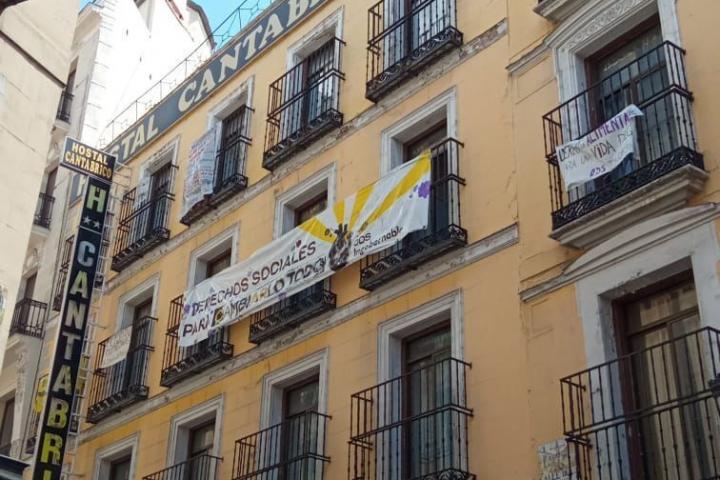 Este domingo, quienes hicieron posible ese lugar en el centro de Madrid lo han vuelto a hacer realidad. A unos metros de la Puerta del Sol, donde los candidatos a las elecciones y el alcalde Jose Luis Martínez Almeida - cuya cruzada contra la Ingobernable tomó por bandera de campaña en 2019- escuchaban el himno de España en el acto institucional por el Dos de Mayo, una multitud de activistas tomaban el edificio del antiguo Hostal Cantábrico de la calle Cruz 3 y 5 y lo convertían en una Oficina de Derechos Sociales (ODS).