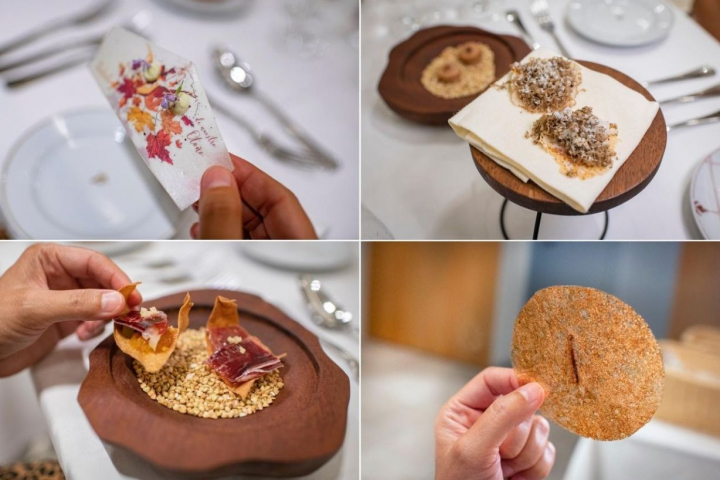 Tras una recepción con cava en la que los Torres y Puiggrós dieron personalmente la bienvenida, el menú arrancó con cinco aperitivos elaborados por Sergio y Javier convertidos en todo un homenaje al otoño: el pan de otoño serigrafiado con tinta de flores, el crujiente de jamón reserva de cinco años con encurtidos y tomate -su particular guiño al pa amb tomàquet-, el bombón de hueva de atún de la Marina Alta, el dentelle de trufa de otoño y una delicada galleta de fósil de anchoa.