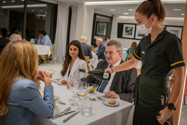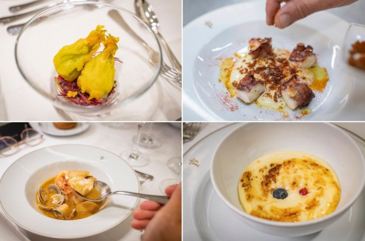Por su parte, Puiggrós deleitó a los comensales con platos como las delicadas flores de calabacín en tempura rellenas de queso de cabra con base de puré de remolacha, el pulpo de roca al ’All cremat” -uno de los éxitos del parador-, servido con cremoso de patata caliente y polvo de ajo dorado por encima; y el suquet de pescado de roca con escorpora, gambas y almejas, toda una oda a la cocina marinera de la Costa Brava.