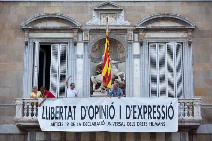 Los abogados de la Generalitat consideran que esa pancarta es “una manifestación política” y pideron al TSJC que suspendiera la orden de retirada. Torra la comparó con otras “manifestaciones de tipo político amparada por la libertad de expresión”, como los carteles contra la devolución de los “papeles de Salamanca” que exhibió el Ayuntamiento de esta localidad. O con otros a favor de los refugiados, como el que colgó la exalcaldesa de Madrid Manuela Carmena cuando capitaneaba el consistorio de la capital.