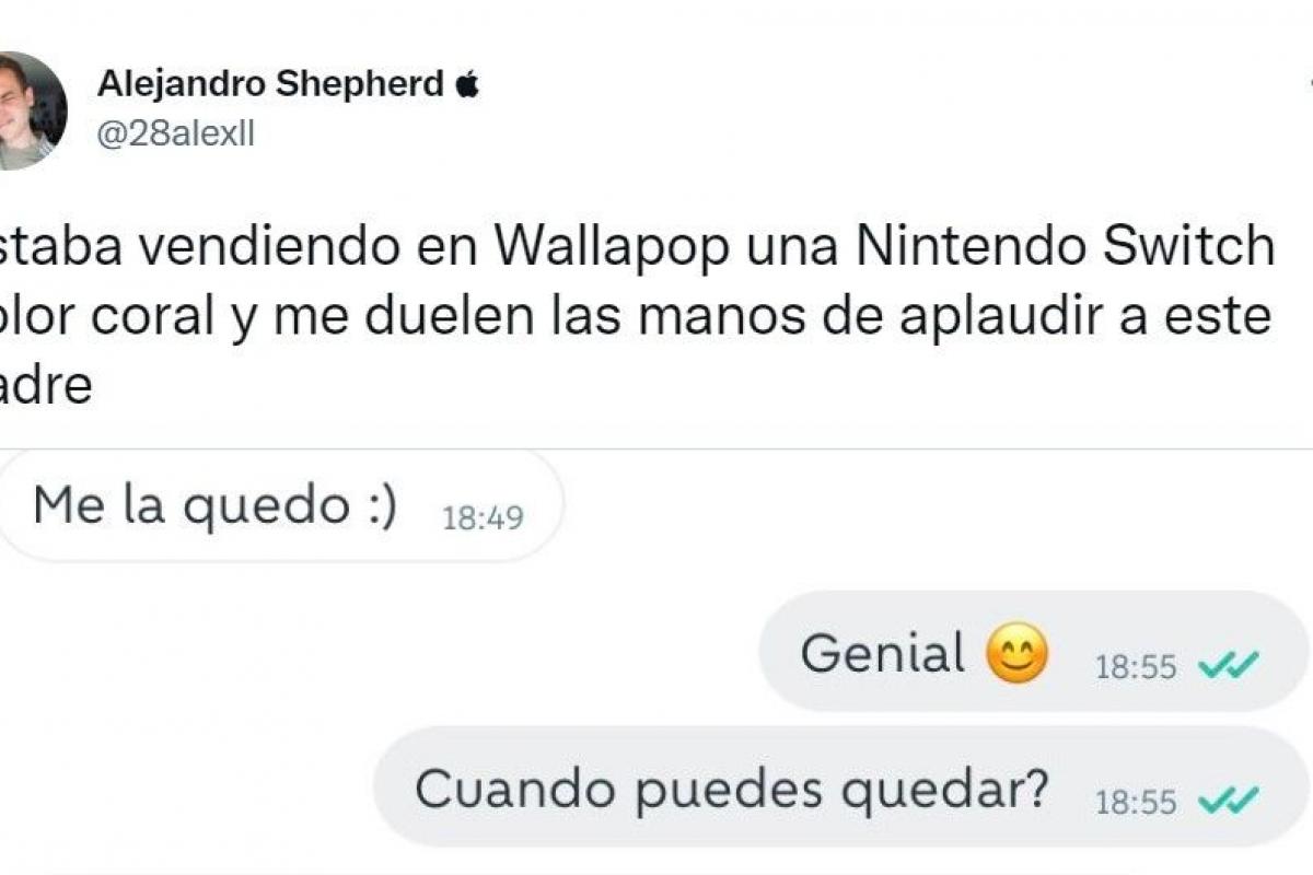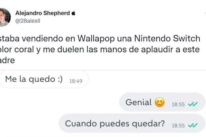 “Estaba vendiendo en Wallapop una Nintendo Switch color coral y me duelen las manos de aplaudir a este padre”, ha escrito el usuario en Twitter, junto a una captura de la conversación.