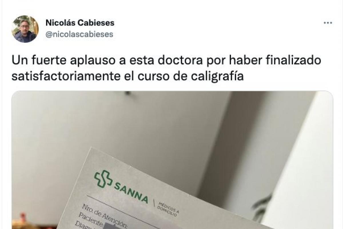 La imagen la ha subido a la red social el usuario @nicolascabieses junto al mensaje: “Un fuerte aplauso a esta doctora por haber finalizado satisfactoriamente el curso de caligrafía”.