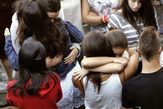 Compañeros de Asunta se abrazan durante el entierro de la pequeña.