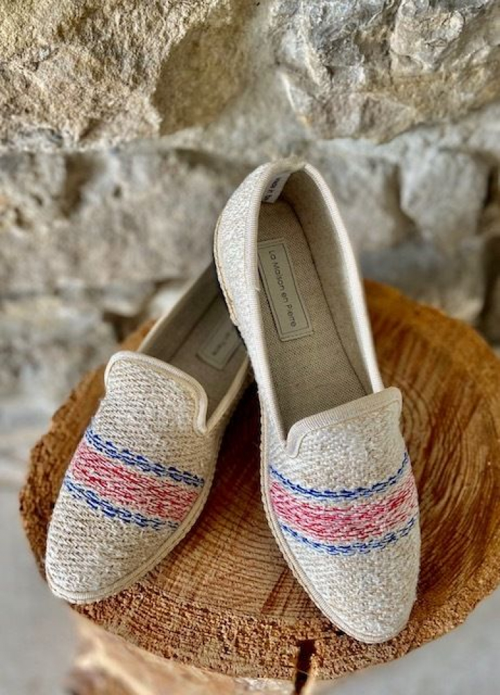 Los accesorios de La Maison en Pierre son sostenibles en muchos niveles. En primer lugar, utilizan material vintage y la producción de excedentes de cuero, que tiene la ventaja añadida de hacer cada bolsa única. En segundo lugar, minimizan el desperdicio de material utilizando el lino sobrante de la producción de sus bolsas para la creación de otros accesorios. Por último, sus creaciones están hechas de un tejido muy resistente que realmente ha pasado la prueba del tiempo. Recientemente han ampliado su colección de bolsos para incluir cinturones y zapatos, todos hechos a mano en Italia por artesanos expertos como Mario, de Milan o o las damas de Friuli quienes hicieron los zapatos Friulane.