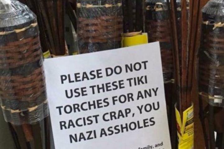 El cartel dice: "Por favor, no utilice estas antorchas tiki para ninguna mierda racista, tú, nazi gilipollas. Son para barbacoas con amigos, familiares y hasta con tu vecino Steve, el del ojo perezoso que le da un poco de miedo a todo el mundo pero que siempre trae un guacamole casero genial, así que lidias con sus vibraciones extrañas, porque es más fácil que aprender a hacer guacamole".