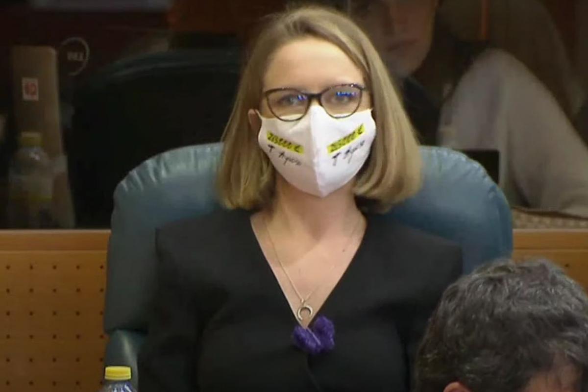 Carolina Alonso, diputada de Unidas Podemos en la Asamblea de Madrid, se ha presentado este jueves en la sesión con un cubrebocas que ha llamado y mucho la atención.