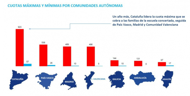 Un año más Cataluña lidera la cuota máxima que se cobra a las familias de la escuela concertada, 923 euros (Sant Paul’s School), seguida de País Vasco (536 euros, Alemán San Bonifacio), Madrid (489, Estrella Toledano, incluye comedor y servicios complementarios) y Comunidad Valenciana (486, Gençana).