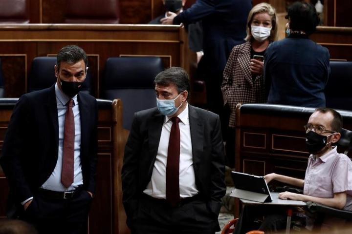 De izquierda a derecha, el presidente del Gobierno, Pedro Sánchez; el portavoz del PNV, Aitor Esteban, y el de Podemos, Pablo Echenique en el Congreso este 21 de octubre.EFE