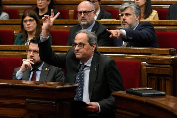 La votación de este lunes en la Cámara ha puesto a prueba el pacto de Gobierno entre ERC y Junts, y acerca a Cataluña a un escenario de elecciones anticipadas que ya piden los Comunes. El Parlament está comandado por los republicanos y sobre su presidente, Roger Torrent, planea una querella de Ciudadanos por un delito de desobediencia en caso de que permita a Torra participar en el debate.