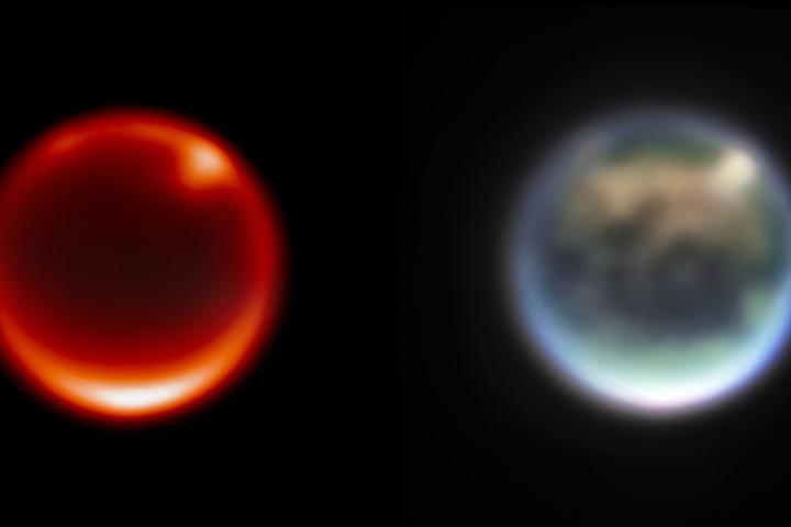 La imagen de la izquierda utiliza un filtro sensible a la atmósfera inferior de Titán. Los puntos brillantes son nubes prominentes en el hemisferio norte. La imagen de la derecha es una imagen compuesta en color.