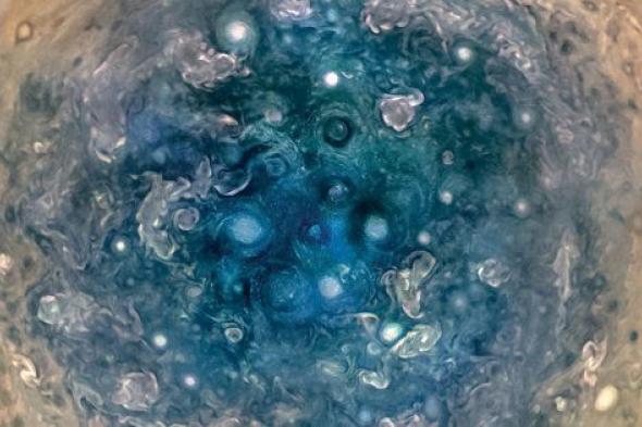 En uno de los primeros estudios, Scott Bolton presenta los resultados del vuelo de Juno por encima de las cimas de nubes. Una mirada a los polos del planeta ha demostrado que están cubiertos con decenas de tormentas densamente agrupadas, posiblemente dejando caer granizo o nieve. Las imágenes muestran una escena caótica muy diferente de las regiones polares de Saturno, ciclones de características ovaladas brillantes que llegan a tener más de 1.400 kilómetros de diámetro.