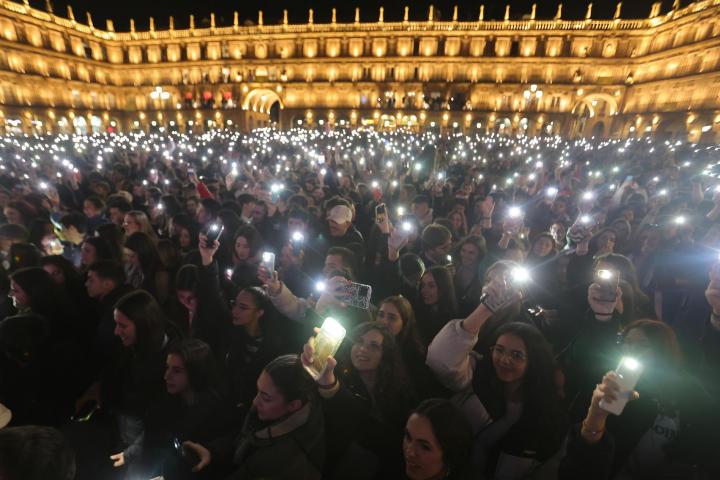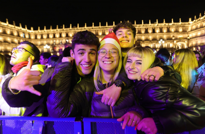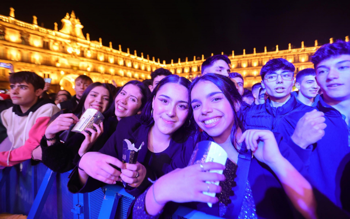 A las doce de la noche, mientras sonaban unas campanas figuradas, los miles de jóvenes -según fuentes policiales algo más de 15.000 personas- que se congregaron en la Plaza Mayor salmantina se comieron las gominolas, en una tradición que comenzó en 1999 de manera espontánea y que con los años se ha convertido en una fiesta masiva, en esta edición organizada en solitario por la Asociación de Hostelería de Salamanca.
