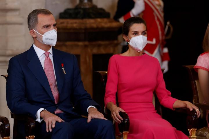 Este viernes, durante la imposición de las condecoraciones de la Orden del Mérito Civil en el Palacio Real, la consorte ha elegido un vestido midi fucsia, con cuello caja y manga francesa de Moisés Nieto. Es la primera vez que la reina viste una prenda de este diseñador español y ha decidido combinarla con unos pendientes en tonos rosa y verde de Tous y unos salones destalonados en tono nude de Carolina Herrera.
