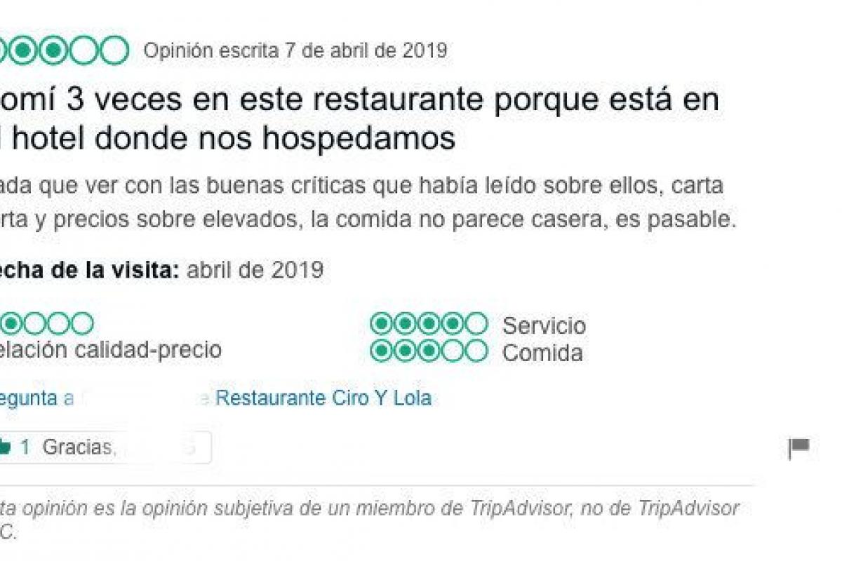 Pero ha ocurrido en los comentarios en TripAdvisor del restaurante Ciro y Lola de Sigüenza, en Guadalajara. Todo comenzó en abril, cuando una comensal puntuó al local con un tres sobre cinco.