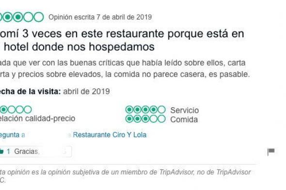 Pero ha ocurrido en los comentarios en TripAdvisor del restaurante Ciro y Lola de Sigüenza, en Guadalajara. Todo comenzó en abril, cuando una comensal puntuó al local con un tres sobre cinco.