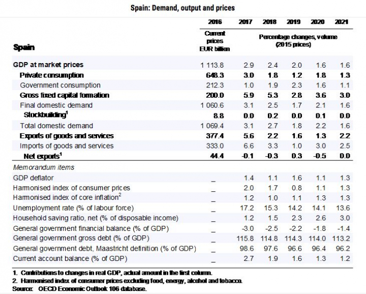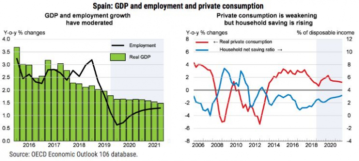A pesar de que España sigue creciendo sustancialmente por encima de la mayoría de economías desarrolladas y de la media de la zona euro (1,2% en 2019, 1,1% en 2020 y 1,2% en 2021), la intensidad de la ralentización de la economía española continuará en 2020, cuando la OCDE confía en que se modere e incluso se revierta en la mayoría del resto de economías.