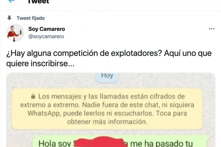 Pocas veces una oferta de trabajo ha indignado tanto y a tantas personas en Twitter. La cuenta Soy Camarero, dedicada a compartir contenido relacionado con el mundo de la hostelería, ha publicado una indignante conversación de WhatsApp entre el dueño de un local y una persona que aspiraba a un empleo.