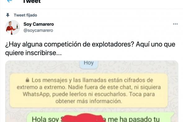Pocas veces una oferta de trabajo ha indignado tanto y a tantas personas en Twitter. La cuenta Soy Camarero, dedicada a compartir contenido relacionado con el mundo de la hostelería, ha publicado una indignante conversación de WhatsApp entre el dueño de un local y una persona que aspiraba a un empleo.