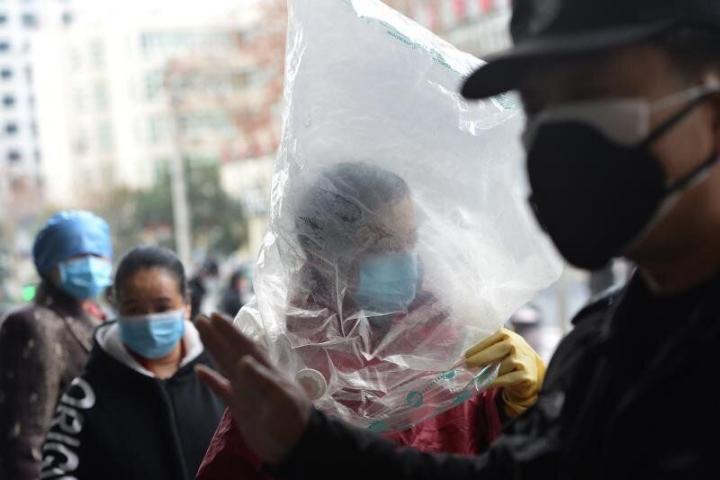 A masked shopper wearing a plastic bag is seen outside a supermarket in Wuhan, the epicenter of the novel coronavirus outbreak, in central China's Hubei province, 10 February 2020. EFE/EPA/SHEPHERD ZHOUEFE