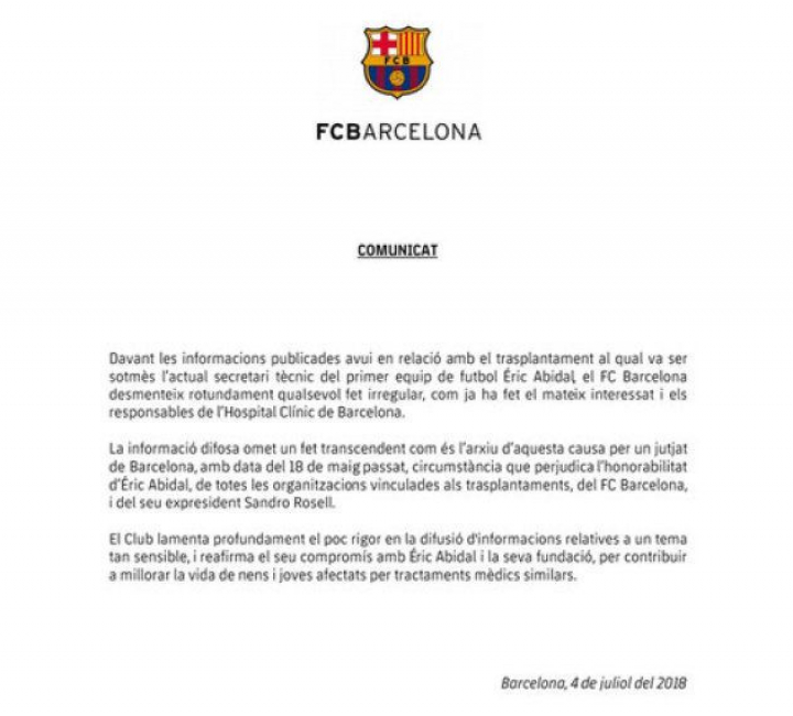 Su club también niega la mayor: el FC Barcelona ha desmentido "rotundamente" que se haya producido cualquier "hecho irregular" en la operación. "La información difundida omite un hecho trascendente como es el archivo de esta causa por un Juzgado de Barcelona, con fecha del 18 del pasado mayo, circunstancia que perjudica la honorabilidad de Eric Abidal, de todas las organizaciones vinculadas a los trasplantes, del FC Barcelona y de su expresidente Sandro Rosell", asegura la entidad en otro comunicado.