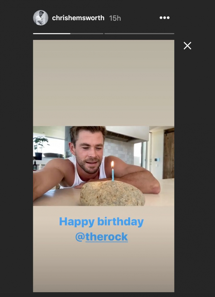 Chris Hemsworth no renuncia jamás al sentido del humor. El actor ha felicitado a su compañero Dwayne Johnson a través de sus stories de Instagram, y ha aprovechado para hacer una pequeña broma.