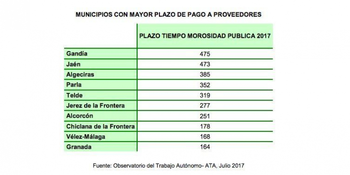 Gandía (475) es el municipio que más tarda en pagar. Fuengirola, el que menos (9 días). De acuerdo al criterio de ATA, la administración local es la peor pagadora, "ya que se demora de media prácticamente tres meses (88 días) en pagar a sus proveedores autónomos", señala en el informe. "Además, ésta es el tipo de administración para la que más trabajan los autónomos", incide. "Prácticamente triplica lo que establece la Ley de Morosidad y la Directiva Europea de Lucha contra la Morosidad (30 días)", lamenta la organización.
