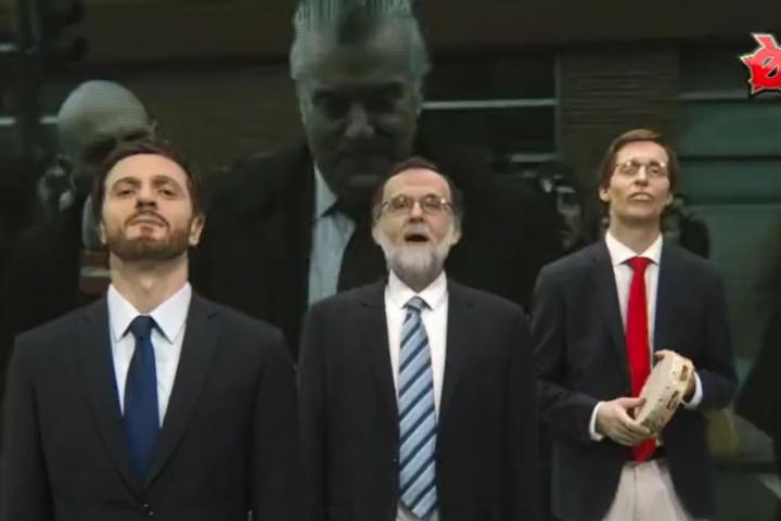 El último en entrar en escena es Luis Bárcenas esposado junto a algunos policías recordando que al final el único que ha acabado en prisión es él: “Mis papeles os mandaban a prisión, y quien está en prisión pudriéndose soy yo”. Entonces Almeida, Casado y Rajoy cantan al unísono el estribillo: “Han imputado 500 cargos y van a imputar 500 más, ya será un millar de casos aislados, no hay que generalizar”.