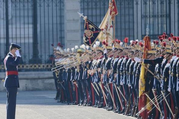 A su llegada, a los Reyes les recibe el presidente del Gobierno y los ministros de Defensa y de Interior. Después suben a la tarima desde la que escuchan el himno nacional. Suenan también las 21 salvas artilleras, habitualmente disparadas desde el Campo del Moro. A continuación pasa revista a la formación de la Guardia Real formada en la Plaza de la Armería.