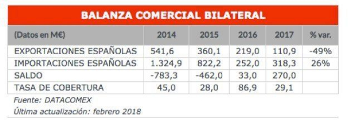 Las exportaciones españolas se situaron en 540 millones de euros en 2014 para caer posteriormente a 360 millones en 2015, a 219 millones en 2016 y a 110 millones 2017, según los datos de Datacomex recogidos por el Ministerio de Asuntos Exteriores.