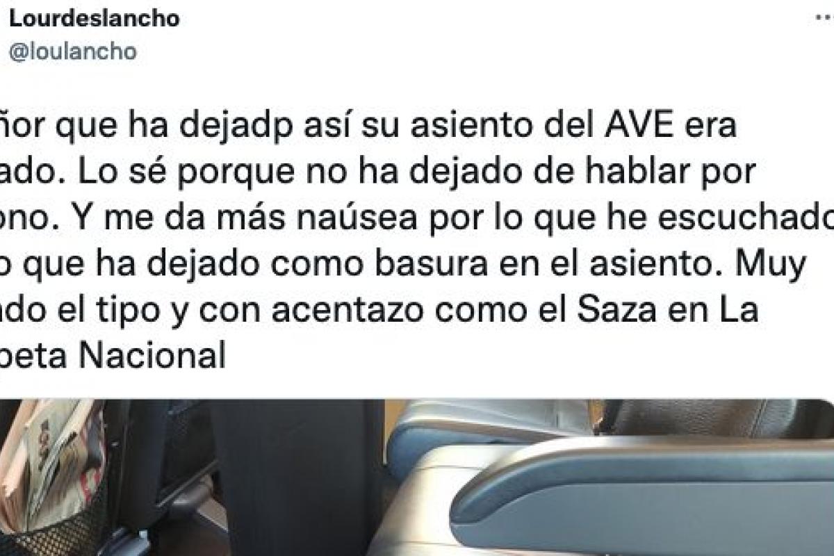 “El señor que ha dejadp así su asiento del AVE era abogado. Lo sé porque no ha dejado de hablar por teléfono. Y me da más naúsea por lo que he escuchado que lo que ha dejado como basura en el asiento. Muy estirado el tipo y con acentazo como el Saza en La Escopeta Nacional”, ha escrito la comunicadora.