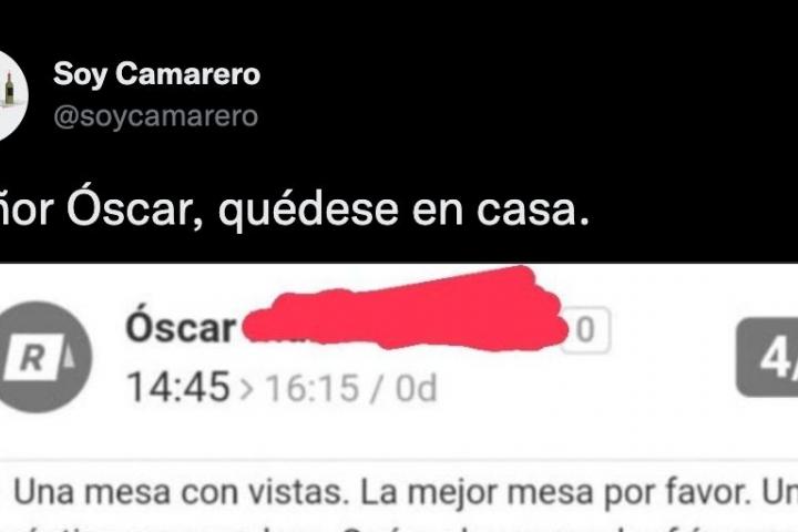 La cuenta de Twitter @soycamarero ha publicado la solicitud, o exigencia, de un comensal al hacer una reserva con una contundente frase: “Señor Óscar, quédese en casa”.