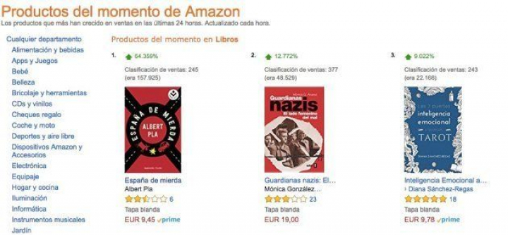 La web de Amazon muestra el vertiginoso ascenso de la primera novela de Pla en su apartado Productos del momento (en la categoría libros). Las ventas han aumentado un 65% en las últimas 24 horas. La publicación ha pasado de estar posicionada como el producto número 157.925 en ventas a situarse en el puesto 245.