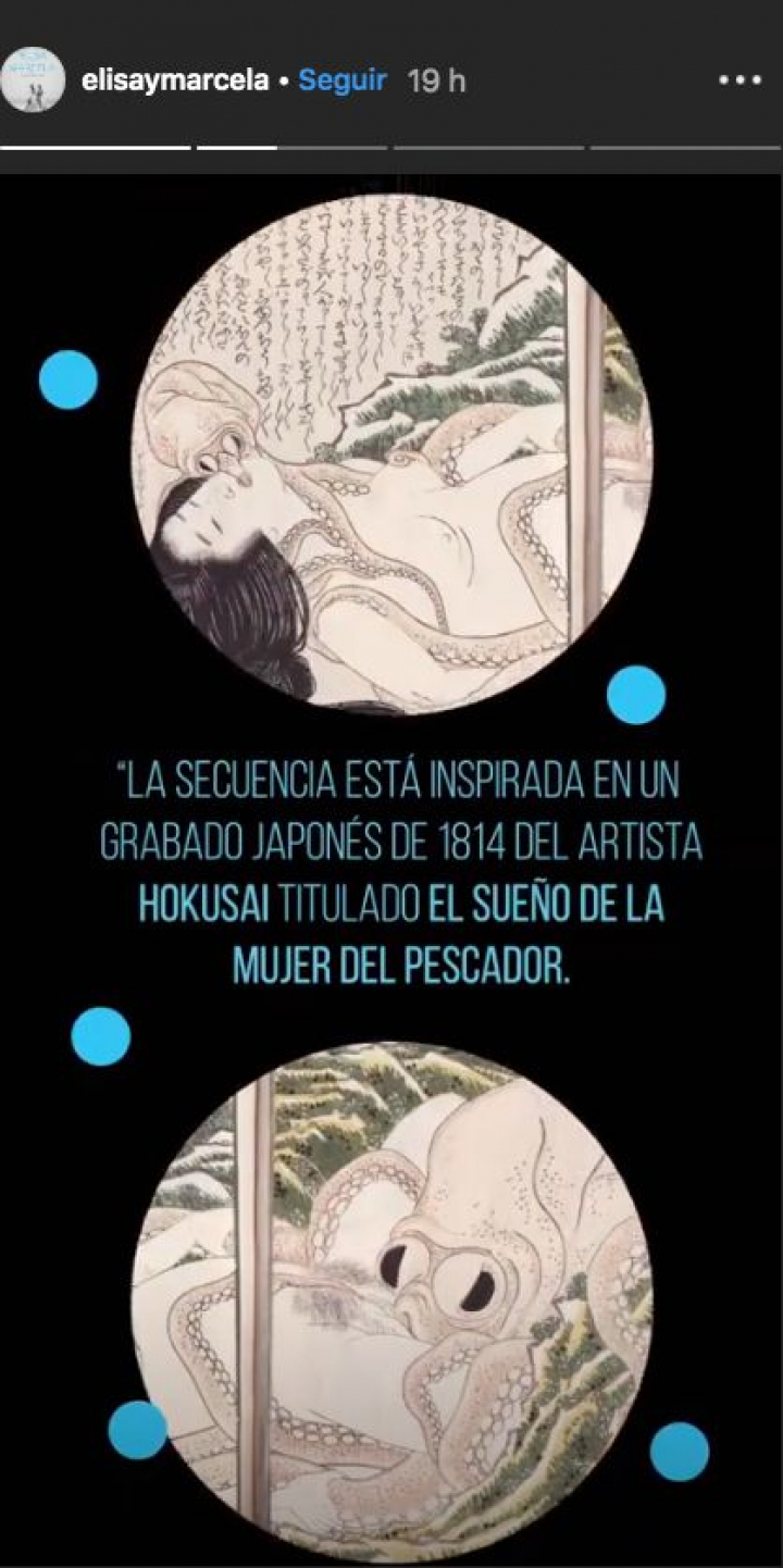En las stories publicadas en el perfil señala que la escena del pulpo está basada en el grabado japonés de 1841 El sueño de la mujer del pescador, de Hokusai.