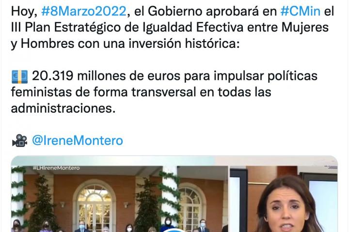 En otro tuit, la cuenta oficial del ministerio recoge unas declaraciones de Irene Montero en La Hora de la 1 hablando del plan que ha puesto en marcha: “Este plan marca la hoja de ruta política del Gobierno y de todas las administraciones públicas para conquistar la igualdad real y efectiva entre mujeres y hombres en todos los ámbitos de nuestra sociedad”.