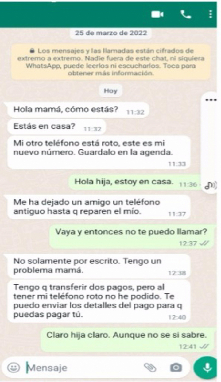 La acción suele empezar con un mensaje de WhatsApp en el teléfono de la víctima con un texto similar a: “Hola mamá. Mi otro teléfono está roto. Este es mi nuevo número que puedes guardar. ¿Estás en casa?”.