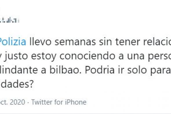 Un tuitero, tras ver que no iba a poder cambiar de localidad, decidió hacer una consulta a la policía de Bilbao este miércoles: “Llevo semanas sin tener relaciones sexuales, y justo estoy conociendo a una persona de un pueblo colindante a Bilbao. ¿Podría ir solo para satisfacer mis necesidades?”.