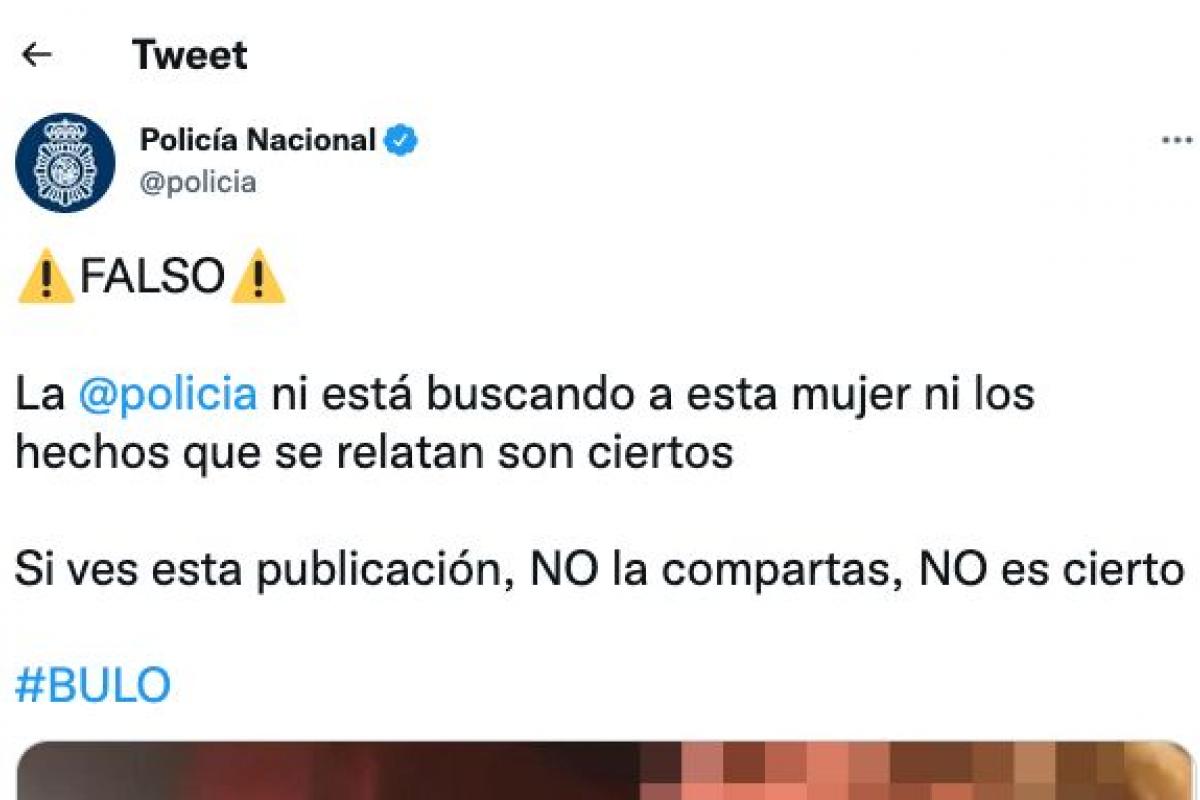La Policía ha alertado de que todo es falso, de que se trata de un bulo. “La @policia ni está buscando a esta mujer ni los hechos que se relatan son ciertos”, asegura el Cuerpo, que remata: “Si ves esta publicación, NO la compartas, NO es cierto”.