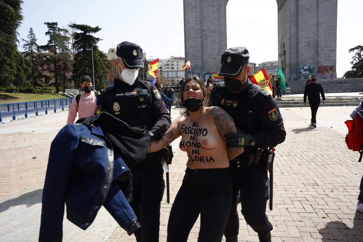 La Policía Nacional ha impedido a varias activistas de FEMEN boicotear un acto franquista que se estaba celebrando en el Arco de la Victoria de Madrid, situado en Moncloa.