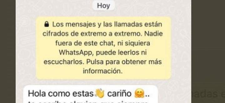 En el mensaje de muestra que ha publicado la Policía se ve el primer WhatsApp que recibe la víctima: “Hola, como estás cariño. Te escribe alguien que siempre te recuerda con mucho cariño desde fuera del país... Adivina quién soy??”.