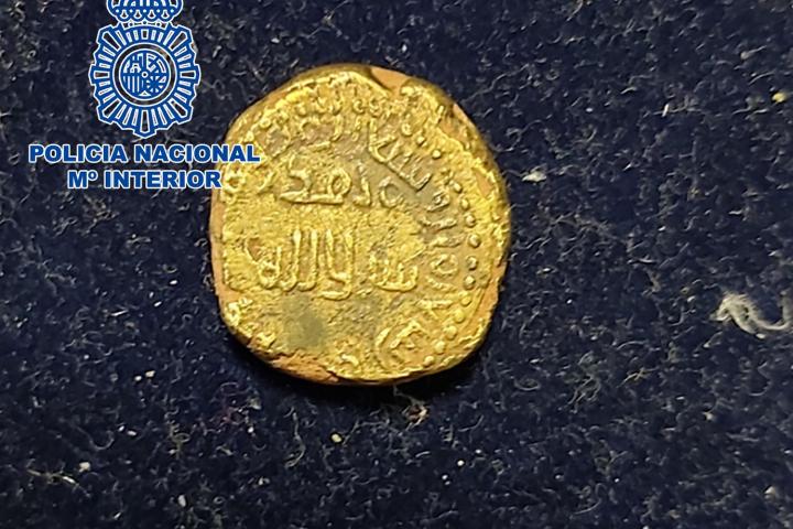 La Policía Nacional ha recuperado en Alicante un dinar de oro hispanomusulmán, fechado en el año 716 o 717 y acuñado en Córdoba. Este hallazgo ha sido localizado junto a otras piezas arqueológicas de gran valor.