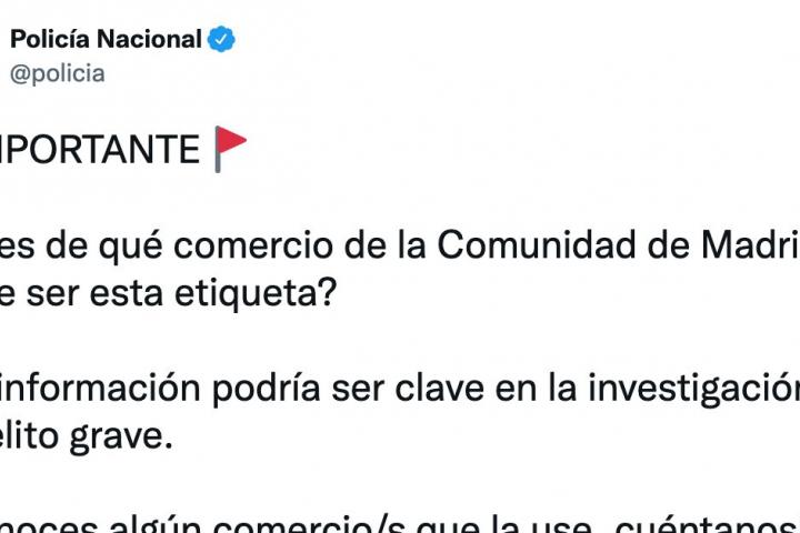 ″¿Sabes de qué comercio de la Comunidad de Madrid puede ser esta etiqueta?”, ha preguntado la Policía Nacional, antes de indicar que “esta información podría ser clave en la investigación de un delito grave”.