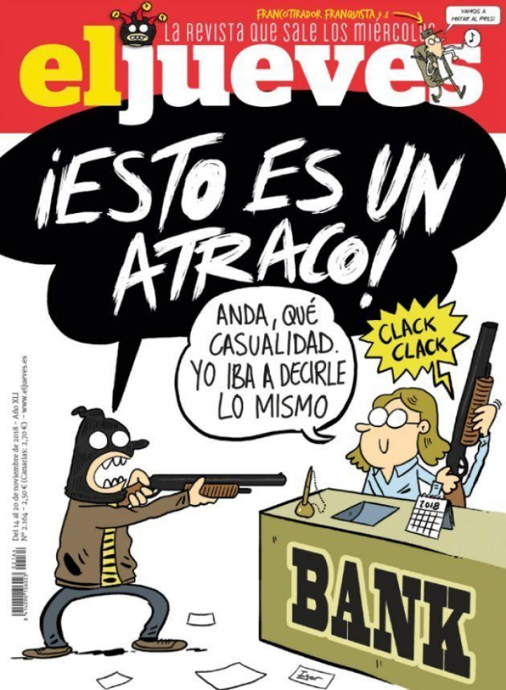 De este modo, El Jueves muestra a un atracador, fusil en mano, entrando en una entidad bancaria al grito de "¡esto es un atraco!". La cajera del banco, tranquila y sonriente, esgrime otra arma de fuego en sus manos y, mientras llena el cargador, afirma "anda, qué casualidad, yo iba a decirle lo mismo".