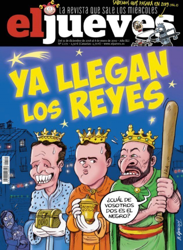 La revista satírica El Jueves ha aprovechado las fechas navideñas, y la próxima llegada de los Reyes Magos, para resumir en su portada de esta semana —adelantada del miércoles al lunes— lo que, en su opinión, nos espera en España con el ascenso de la derecha representada por PP, Ciudadanos y, sobretodo, los ultras de Vox.