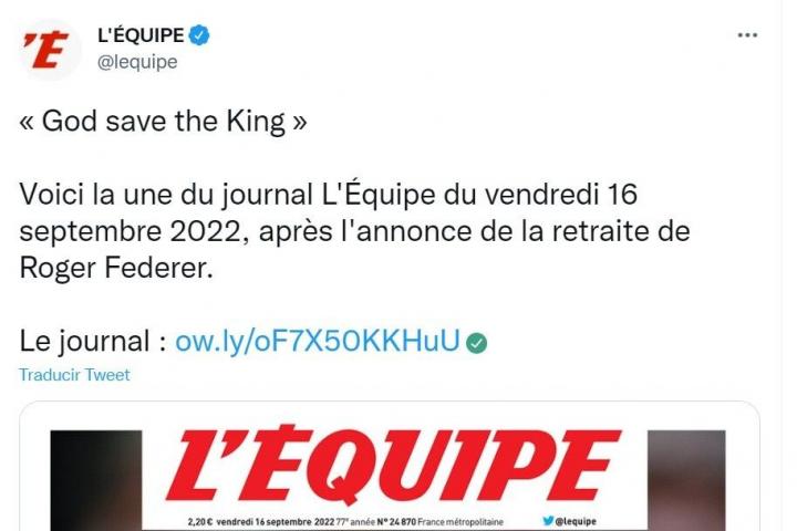 Aprovechando el God save the king (Dios salve al rey) del que tanto se ha escrito tras el fallecimiento de la reina Isabel II, el medio galo ha colocado a Federer en la portada junto al título de esta canción británica.
